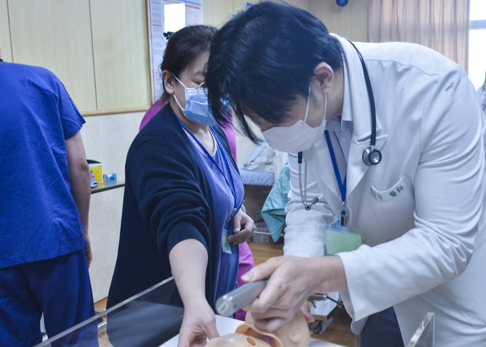 台北慈濟醫院急診部以EPAs 評核住院醫師的執行能力,即住院醫師操作時,由主治醫師在一旁評估熟練度,左為陳玉龍醫師。