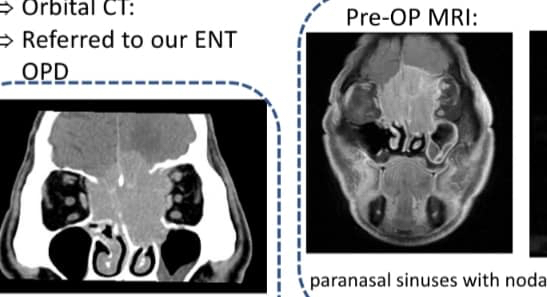 二○二二年九月,一位男士被轉診到花蓮慈濟醫院耳鼻喉科看診,轉診前已經看過好幾個神經外科和眼科,主治醫師周昱甫回憶當時:「看到阿伯額頭凸凸,眼距開開,檢查後發現他的腫瘤從大腦額葉,到雙側眼眶到鼻腔上部,占據整個前顱底⋯⋯」,這位先生罹患的是「嗅神經母細胞癌」。