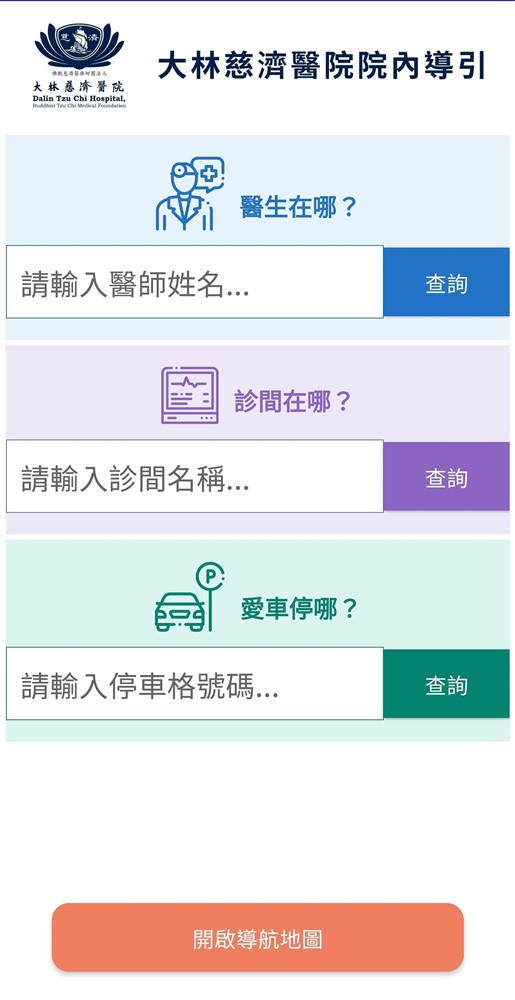 院內導航:功能包含院內醫師、診間、地下停車場之停車格導引,根據使用者的不同需求,輸入醫師姓名、診間號碼、停車格號碼等,能夠精確導引使用者至目的地,節省尋找時間。