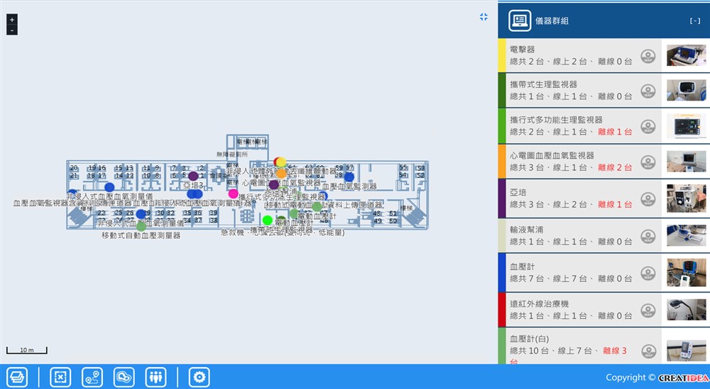 在應用上,可以用來為儀器設備定位,清楚掌握儀器設備所在位置,確認其是否在線上。設置連結於護理站電子白板,以便護理人員快速進入操作介面。