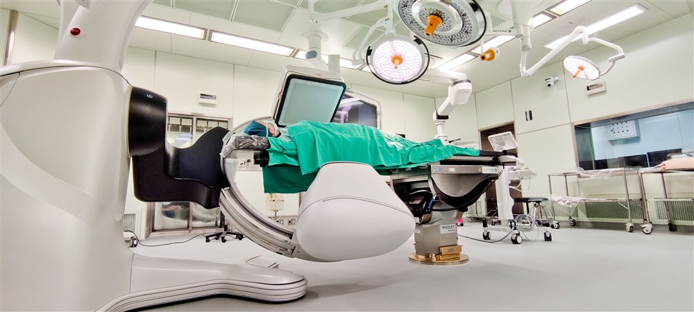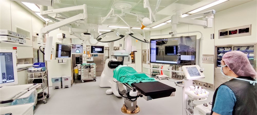 「複合式手術室」最大的特色是整合高階影像設備在同一個手術空間,傳統手術若需要確認精密影像,常必須暫停手術並將病人轉送到電腦斷層室檢查,不僅增加麻醉時間,也提高移動風險。複合式手術室則透過滑軌式電腦斷層掃描儀與多軸機械臂,讓影像掃描與手術同步進行。