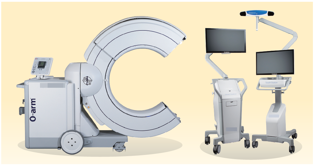 左側設備:O-arm ™ 術中 3D 影像系統 (O-arm Surgical Imaging System),是一臺可以在手術過程中環繞病人拍攝的機器,能即時提供高解析度的2D 與3D 醫學影像(類似術中的電腦斷層掃描)。右側設備:StealthStation ™ 手術導航系統 (StealthStation Surgical Navigation System) 是一套先進的導航定位系統,包含螢幕臺車與上方的紅外線攝影機)。