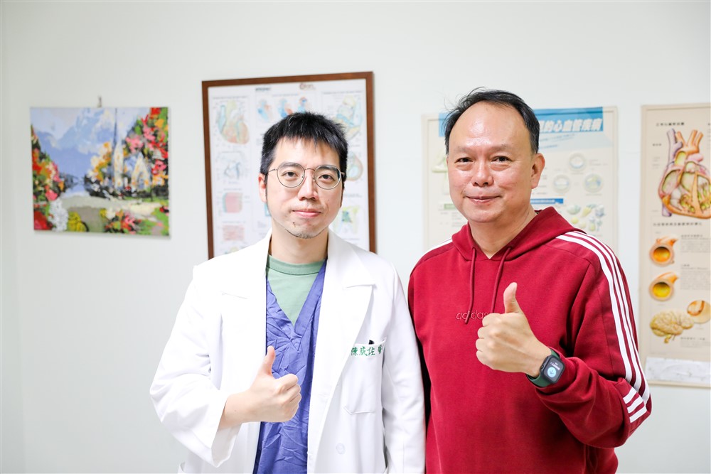 黃郅達先生經藥物治療與電燒手術都無法根治心房顫動,經PFA 脈衝場消融術後,心臟功能恢復正常,連高強度運動也難不倒他,正是東臺灣第一例接受PFA 的病人。上圖為黃先生與主治醫師陳威佐開心合影。