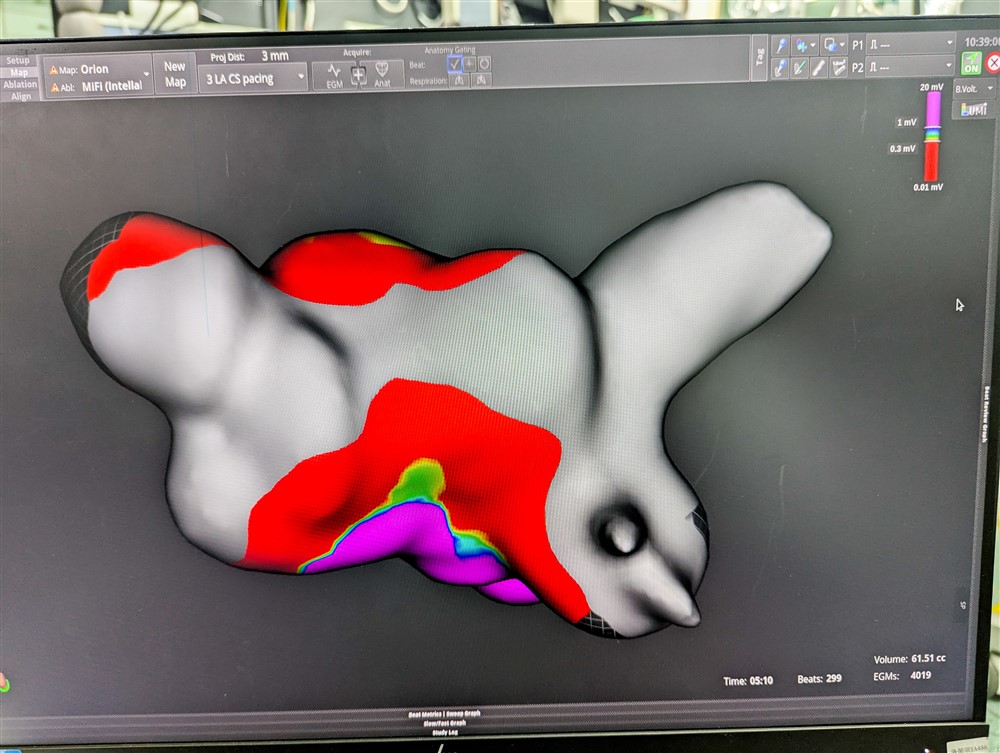 透過3D 立體定位電氣構圖檢查,清楚看見黃先生的左心房,在接受PFA 術式後,成功阻隔異常的電氣活動(紅色區域)。