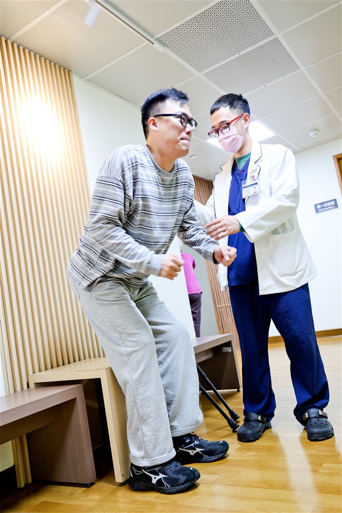 洺哲的復健歷程就像一個進化史,從二○二四年一月受傷初期的臥床和輪椅代步,到四月已能短距離使用助行器,但仍高度依賴輪椅。二○二五年一月,我們成功協助他達成第一個里程碑:全面脫離輪椅。這意味著他具備了在助行器支撐下處理日常生活的能力。而在三月植入SCS 後,進步更是加速,下肢肌力的增強,讓他能從穩定度高但笨重的助行器,進階到僅需兩支前臂柺便能靈活地獨立行走。