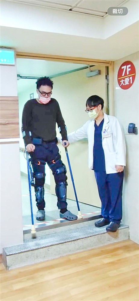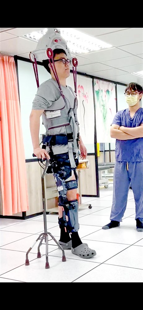 花蓮慈濟醫院復健治療團隊以懸吊系統搭配外骨骼機器人,帶動病人復健。