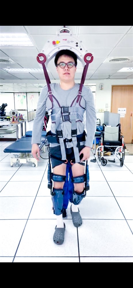 在洺哲還無法自主站立時,我們首先使用了FreeWalk 外骨骼機器人,這套系統提供了穩固的外部支撐與可調式的動力輔助,透過機器人大量重複的帶動行走,加速了下肢動作與步行神經迴路的誘發。當他開始可以使用輔具站立,下肢有部分自主動作後,我們銜接Keeogo 外骨骼機器人進行進階訓練,它能感應患者的動作意圖並給予精準補償,強化其承重及跨步能力,讓他真正學會如何行走。
