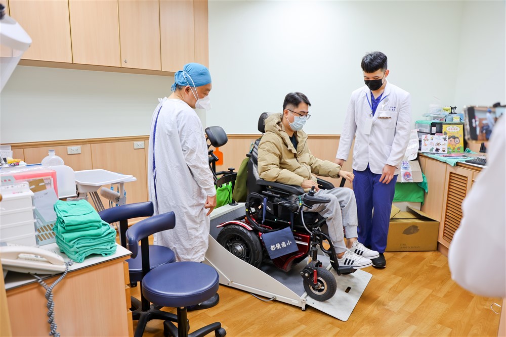 十七歲的小筠(化名)一早從鳳林搭復康巴士獨自來看診。其實她的阿公剛開完刀,也在花蓮慈院住院治療中,得知今天孫女來義診,堅持要下樓來見小筠一面。老人家插著管無法說話,祖孫倆眼眶都濕濕的,牽掛之情盡在不言中。受傷這兩年多來,小筠都在花蓮慈院治療,高中復學後,每個月定期來院做復健,張逸鴻物理治療師對這個年輕的病人並不陌生。雖然日常有居服員照顧起居、協助活動關節,但是她對於居家復健運動有時候會懈怠,加上下肢無力的情況似乎沒有起色,花蓮縣脊髓損傷福利協進會理長「彭姐」彭儀珠建議她來義診現場聽取專家意見,同時做一輪身體檢查。楊士賢醫師經整體評估後,建議強化上肢功能以提升軀幹的穩定度,下肢缺損度較嚴重的部分,仍必須強化肌力訓練,鼓勵她要繼續來醫院做復健。小筠感謝醫生的說明讓她有比較清楚的方向,畢竟坐輪椅之後,許多事情都要重新學習,她希望好好把自己照顧好,不要讓撫養她長大的阿公阿嬤操心。