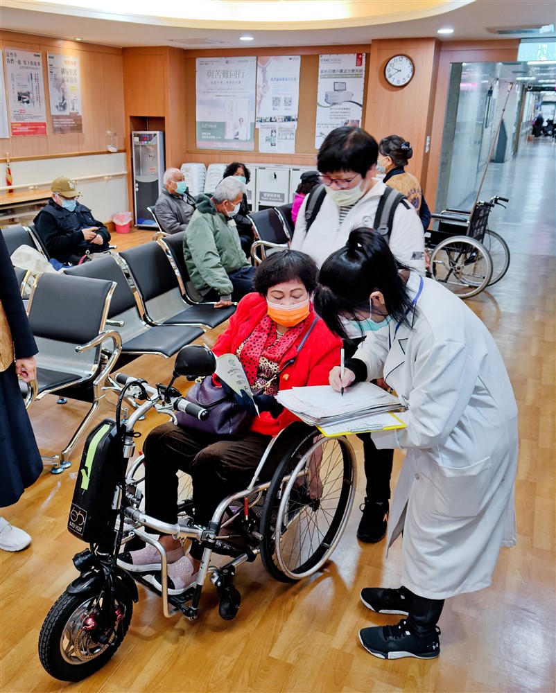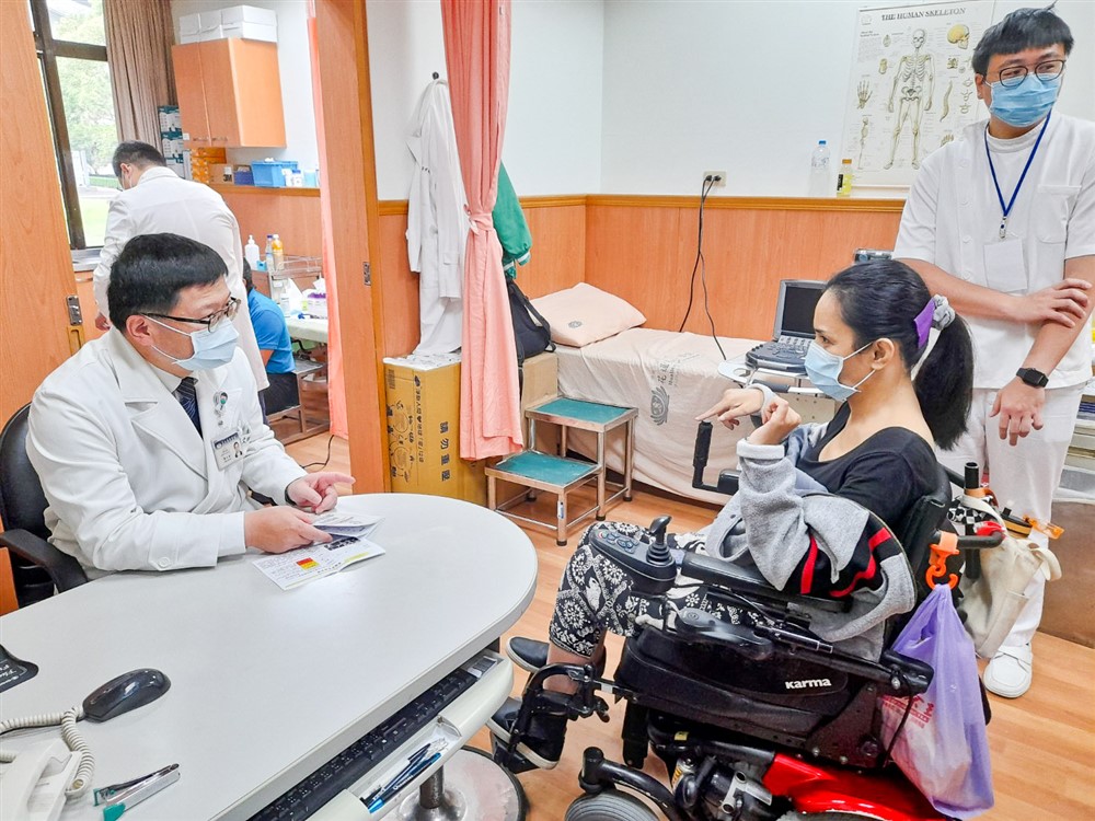 佘紋慈護理師說:「我會給你三個檢查窗口的連絡電話,有任何問題,你就找我。」紋慈很有條理的說明、安排,而如果蔡醫師的門診時間病人沒有空,也可以安排在林欣榮院長的門診,請病人放心,只希望能透過詳細檢查之後,找出能幫助病人改善現況的機會。來自臺東太麻里的病人,在太太及外籍看護的陪伴下來義診。蔡昇宗醫師按他的兩肩,說:「你的肩、背硬得像石頭一樣。」讓太太也笑了。病人談及復健辛苦的感覺,蔡醫師安撫病人:「上半身也要復健,才不會沒力而壓迫已經無法行動的下半身。而上半身也要放鬆,中醫、復健等等,我們都可以安排。」也告知病人中醫門診就在旁邊,等一下讓中醫師處理。病人也提到在關山慈濟醫院中醫針灸治療,讓他的下半身恢復痛感,可惜怕太太太累,從每週一次改為每兩週一次了。