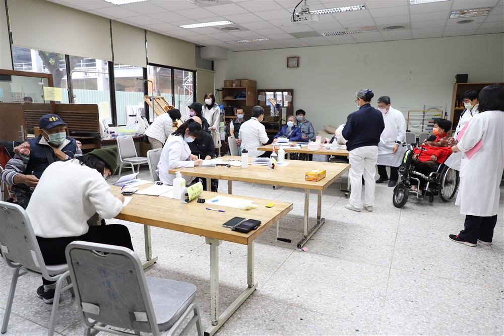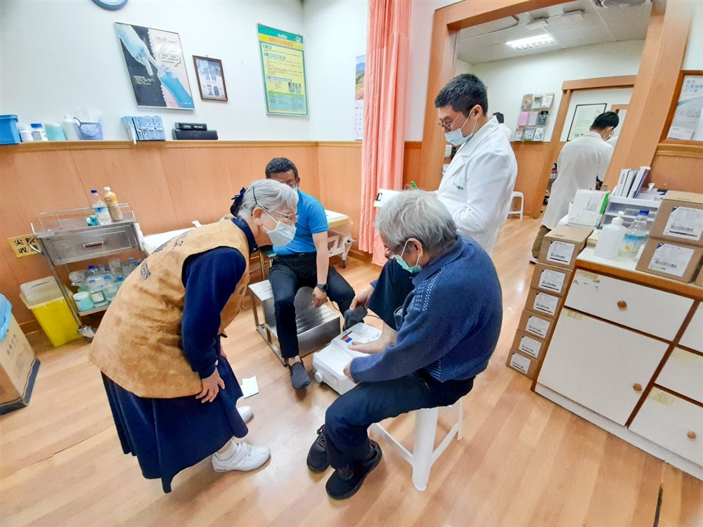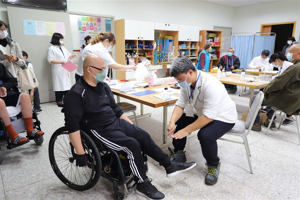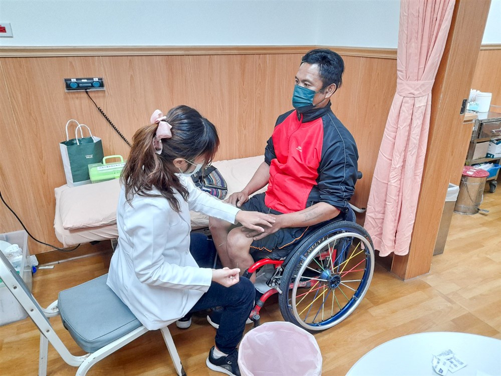 中醫科的義診,由龔彥綸醫師、林慶芳醫師提供針灸、拔罐、貼耳穴等中醫服務。「我很少吃中藥,也沒有針灸過!」很少看中醫的傷友陳淑貞,表示自己經常睡不好,又有身體痠痛的問題,龔彥綸醫師首先幫她按摩手部筋骨,讓她的身體肌肉逐漸放鬆,接著說明會針對安神紓壓的穴位進行針灸,幫助身體放鬆,晚上才會好睡一點。陳淑貞詢問,最近自己腳上出現一個不明的紅腫,不知道是什麼情形,支援中醫義診區的張素雯護理長蹲下來檢查,並提醒她晚點前往骨科義診區時可以請教骨科醫師,若仍有明顯不適,還是要再安排後續詳細檢查比較安心。