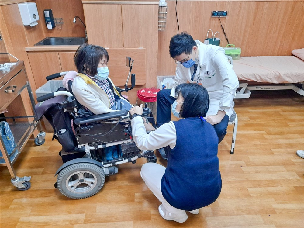 傷友陳淑貞(左)表示自己的腳上突然有一塊紅腫,龔彥綸醫師(右)和張素雯護理長(中)細心檢視。後續骨科葉光庭副主任也為陳淑貞檢視腳上的紅腫。攝影/林芷儀