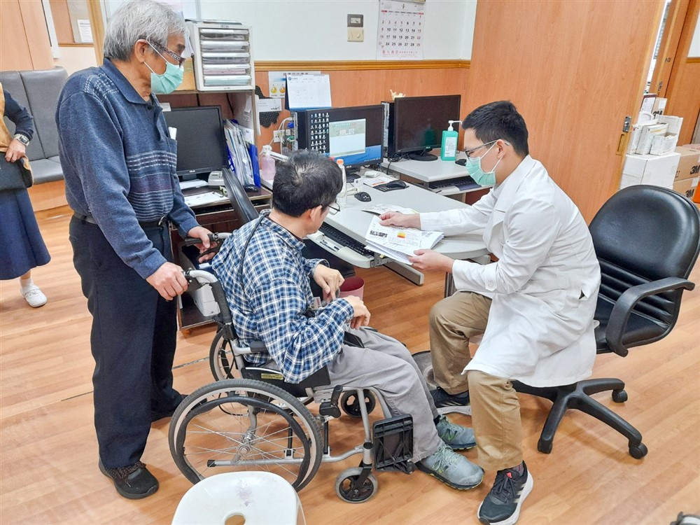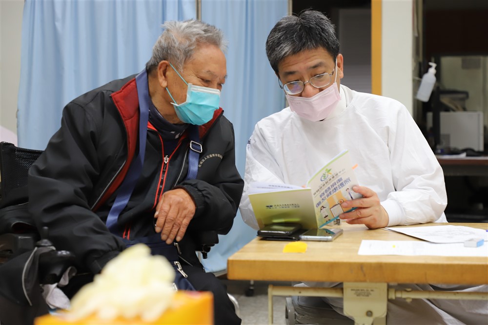 在最後一站提供總諮詢服務的楊士賢醫師,溫柔又條理分明的為病人詳細說解注意事項,叮嚀要如何預防褥瘡、強化手部或足部復健運動等等。他說今天的義診,最要感謝同仁同心協力,包含要評估哪些項目、三個工作站的發想設計、流程與分工等等,都是大家一起討論出來的,整體運作得很順暢,「同仁們都是自願來幫忙,用心投入其中,一團和氣,互相幫忙,真是開心!」