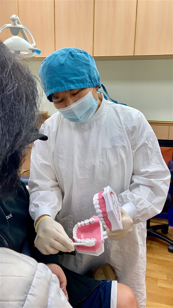 「不行,不及格,上下牙齦都發炎了!」北區人醫會賴秋英醫師形容自己就是「比較囉唆」,她一定會叮嚀口腔清潔的細節,只見她仔細檢查傷友的每顆牙齒後,拿出一組牙齒模型,教導傷友及照顧者如何進行正確的口腔清潔,包括牙刷的握法、正確的刷牙方向、使用牙線來潔牙,最後,提醒傷友三個月後進行追蹤。
