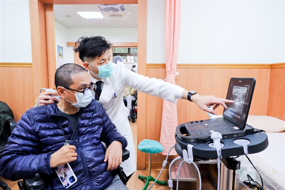 左圖:傷友王先生表示有頸椎痠痛問題,骨科陳顥文醫師以超音波機器找出肌肉痠痛的位置,並以激痛點藥物注射治療。攝影/李玉如