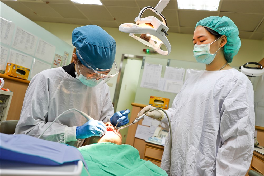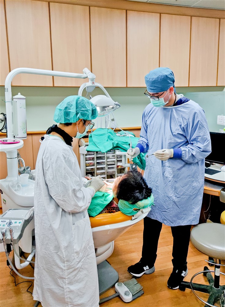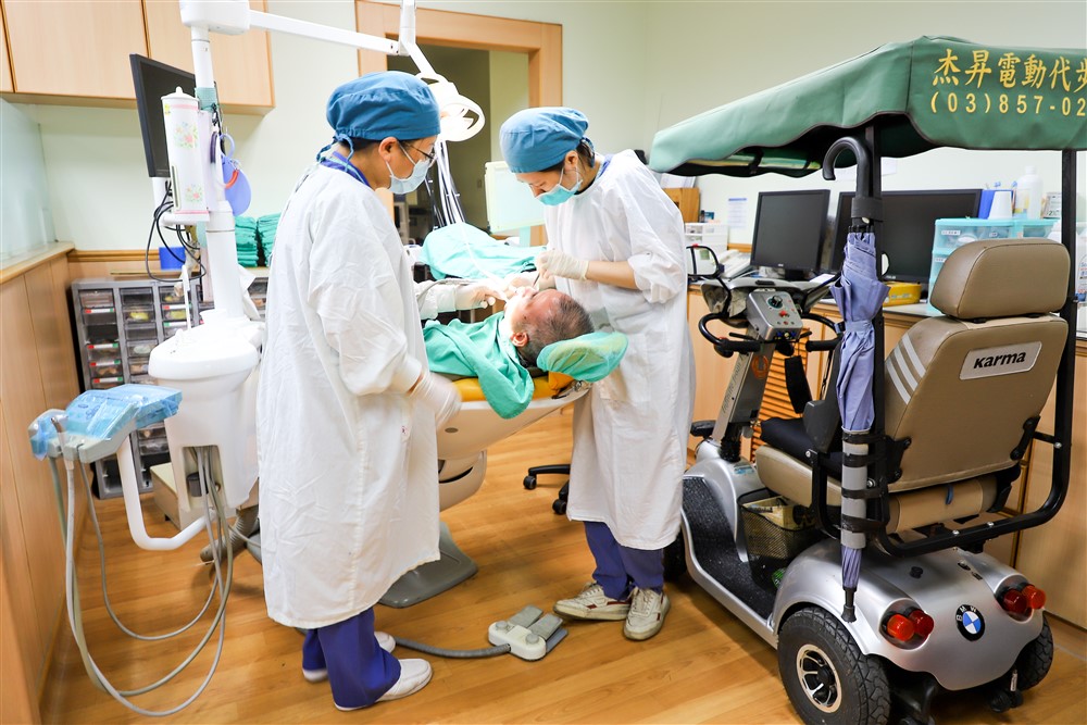 考量輪椅推進的空間,牙科診間規畫出三個區域,各區由兩名醫師駐點,主要的治療為牙齒檢查及洗牙。牙科部特殊需求者牙科主任李彝邦醫師說,此次協助傷友看牙的方式有三種,一種是傷友可藉由手部的輔助自行坐上診療臺,第二種是輪椅變診療椅,可平躺直接在輪椅上看診,第三種,則是身心障礙者診療椅,可讓輪椅直接推上去,由輔助支架來支撐頭部平躺看牙,醫師再藉著移動式的抽吸氣、治療臺,並自行配戴頭燈來完成看診,牙醫團隊當日準備了此三種方式來進行診療。