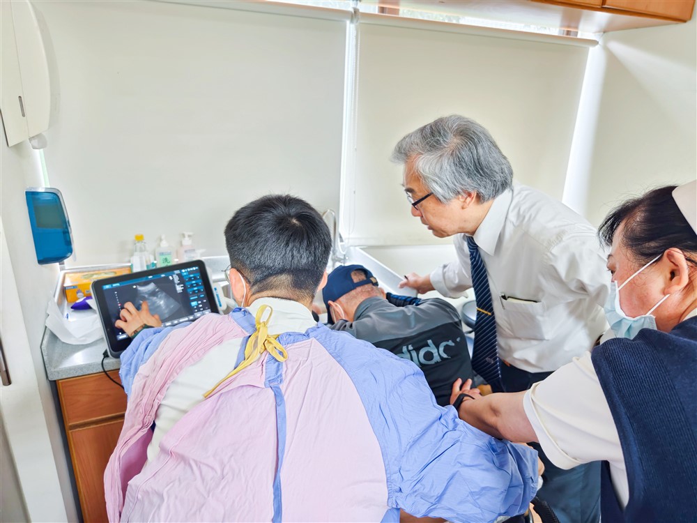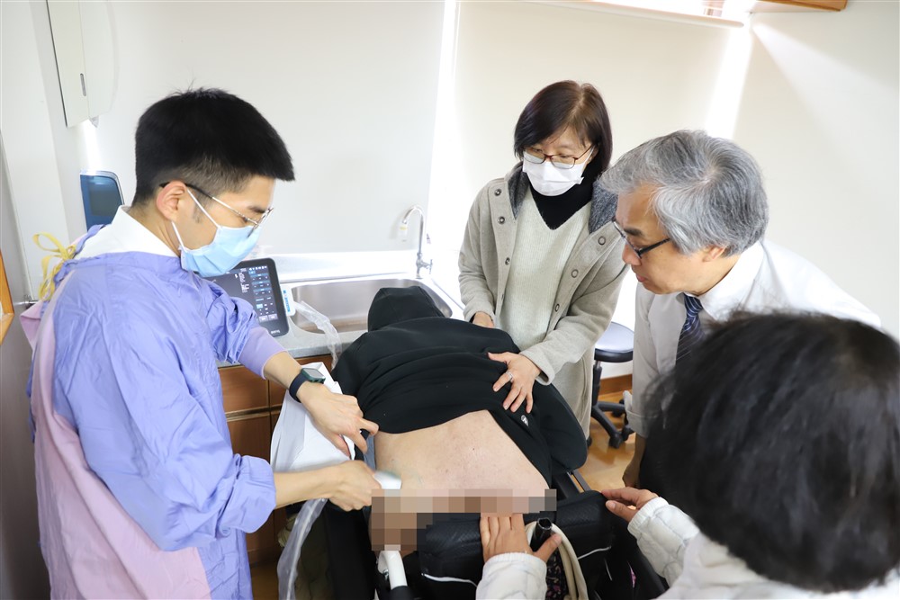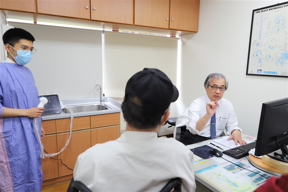 為患有攝護腺腫大的傷友掃描超音波,右一為鄺素敏護理師。攝影/沈健民