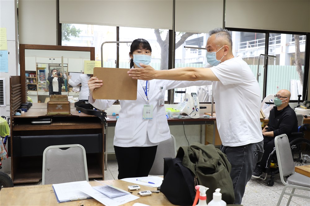 張逸鴻物理治療師在肌力評估站為病人做檢測,包含手肘、手腕、手指的力量及靈活度,腳部的功能等,再為病友依個別情況提供進一步的功能訓練或居家運動指引。他認為在醫院為脊損朋友舉辦多科別義診很有意義,所以主動報名,「夥伴們都很認真、用心在服務上,想方設法協助解決病友提出的問題、給出建議,大家一起把每個環節做好、完成任務。」而執行平衡評估的是魏琦物理治療師,為病人檢測站姿、坐姿、脖子轉動角度的功能性。剛到職三個月的她,此次應同是花蓮人的前輩張逸鴻物理治療師之邀,參與脊損義診,這也是她的義診初體驗,抱持著學習付出的心,兩人都很榮幸能為在地鄉親服務。
