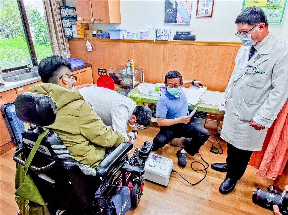 右圖:骨科義診安排脊損傷友進行足踝骨密度分析,葉光庭副主任(左二)與操作專員為傷友檢測,並協助傷友穿脫鞋子。右一為吳文田主任。攝影/謝自富