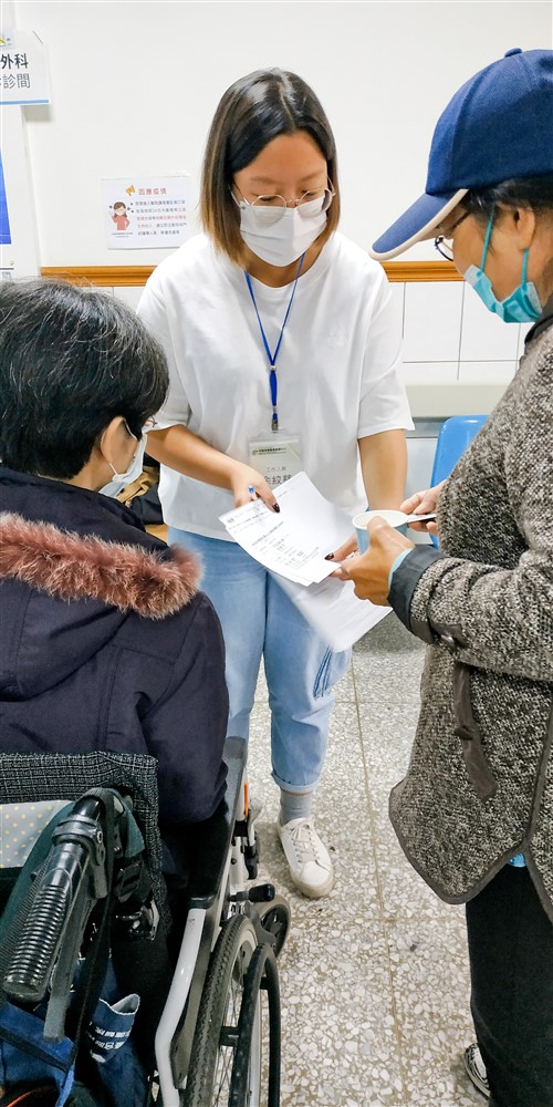 吳孟熹醫師會詢問脊損病人,關於目前的傷口用藥、照護傷口的方式等等,為病人開立一些治療藥膏讓他們帶回去,並教他們居家照護傷口的注意事項,尤其是避免壓傷。專師黃湘玲,拿紗布、藥膏、棉棒,準備換藥的動作一氣呵成,非常嫺熟,是整形外科醫師的好幫手。而整形外科也順道為病人解決了皮膚科的困擾,不管是頸部、下巴、頸後背的皮膚搔抓、粉瘤等等,吳醫師很仔細的說明,也請病人放心,不是腫瘤。至於更進一步的問題,就要看皮膚科了。開刀房書記秋琴也在義診空間幫忙分流、引導,她是看到郭漢崇副執行長前一天在臉書的分享,「我在泌尿科病房當過七年的書記,過來看能幫什麼忙。」