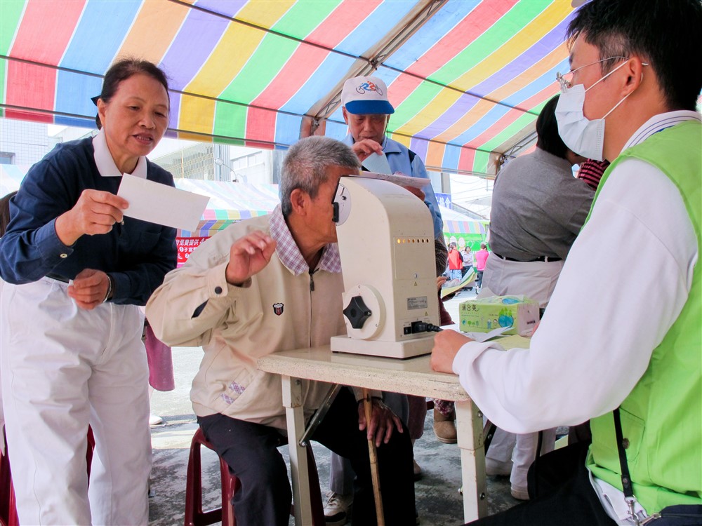 二〇一二年三月嘉義縣衛生局與大林慈濟醫院合辦大埔鄉複合式健康篩檢活動,林余淑卿師姊(左)協助視力檢查。攝影/郭富美