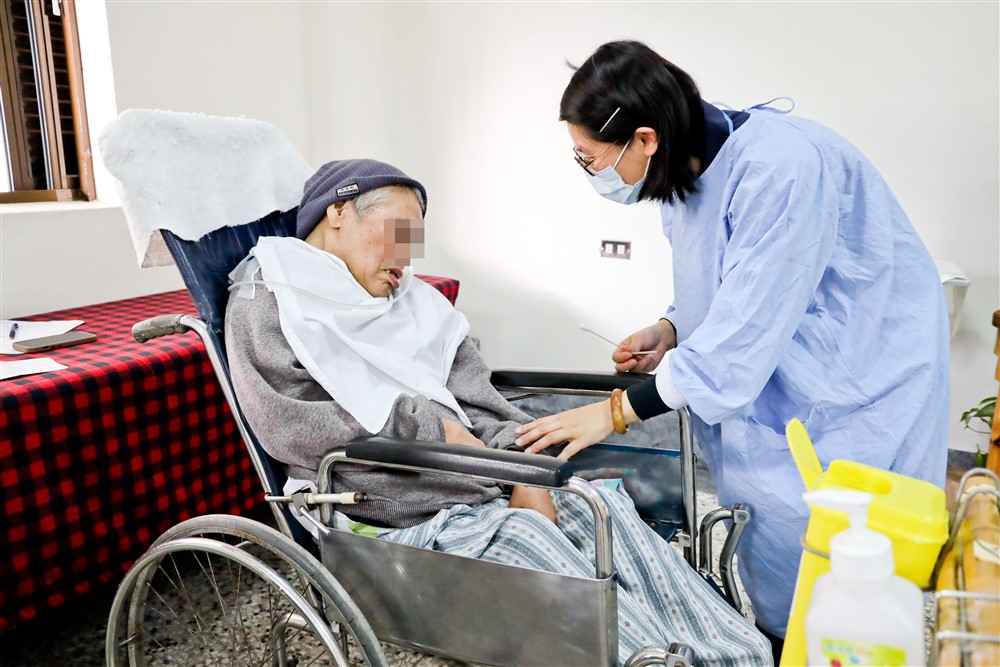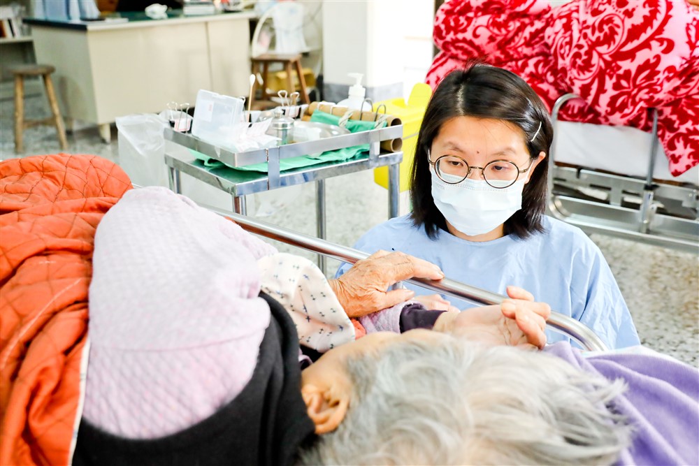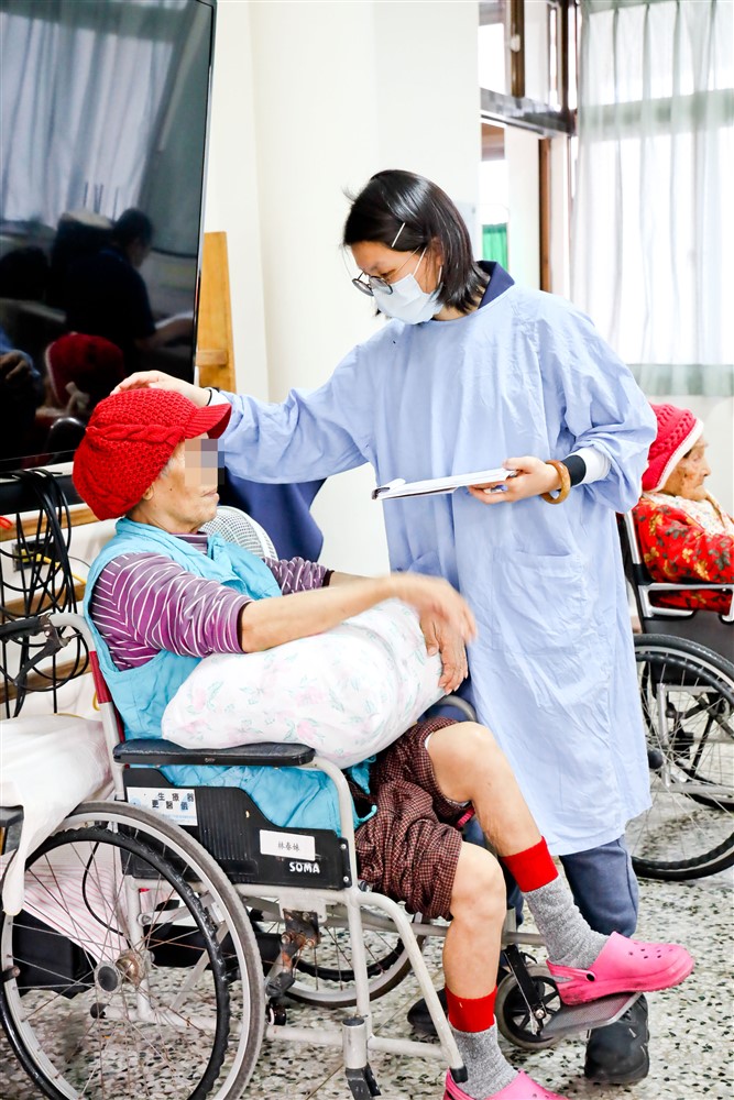 十二月十八日下午,聖十字架療養院中醫特別門診進入年度尾聲。護理人員看到被推來看診的高爺爺在打盹,悄悄在他耳邊喊:「邱美花⋯⋯」原本閉著眼睛的高爺爺突然眼睛一亮,露出笑容。原來,「美花」是高爺爺很喜歡的照顧服務員,他只要聽到「美花」的名字就會心花怒放,因此護理人員經常喊這個名字逗他開心,也讓看診的氣氛變得溫馨和樂。