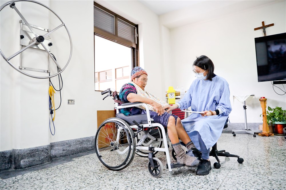 周麗玲護理師說, 余修女剛住進療養院時血壓偏高,巴氏量表評估是「五十五分嚴重依賴」,雖然能行走但容易跌倒,剛來不久時,就因自行上樓發生跌倒事件,造成後腦二點五公分的撕裂傷,是高風險跌倒的照護個案。現已固定服用降血壓藥,巴氏量表也進步到八十五分中度依賴,除了能夠分擔餵食住民及摺衣物的工作,晚上還會巡病房幫其他住民蓋棉被,前來訪視的親友也覺得修女在應對上進步很多。只是,余修女很不能適應這樣的自己,不解身體出什麼毛病會導致快速退化。修女說,中醫改善自己夜間頻尿的困擾,但手腳麻的情況仍會發生,會持續接受中醫治療。