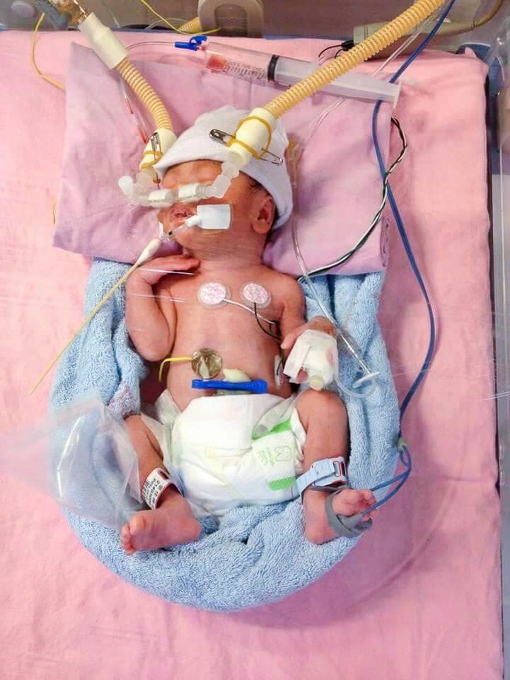 二○○六年一月,體重僅有七百七十克的貝貝在二十七週就猝不及防地來到這個世界,小小的她心跳與呼吸都十分微弱,甚至出現呼吸窘迫症候群,所幸經新生兒科團隊急救後,身上插滿管線的貝貝被放進保溫箱。但是一週後,貝貝突然因開放性導管的問題出現嚴重肺出血,趙露露主任緊急給予藥物治療,再利用呼吸器加速以每分鐘九十下的擬高頻頻率讓肺泡擴張,幫助貝貝呼吸。