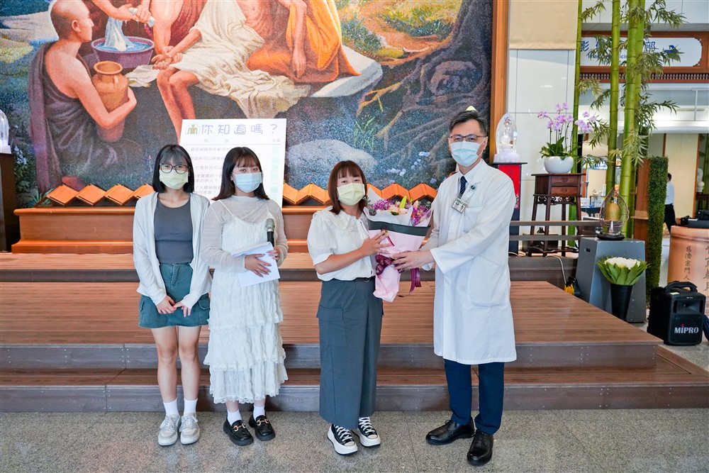 鄭紹彬主任(右一)代表醫院致贈花束給捐贈者家屬黃太太(右二)及其兩位女兒,表達深深的敬意。攝影/卓冠伶