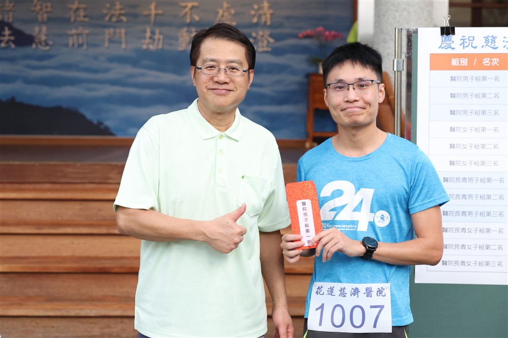 關山慈濟醫院物理治療師潘建志展現練跑兩年多的成果,榮獲醫院男子組第一名,他說跑步有助整頓身心與強化心肺功能,不忘熱情預告相約「明年歡迎花蓮鄉親一起來參加關山慈院二十五周年院慶路跑!」