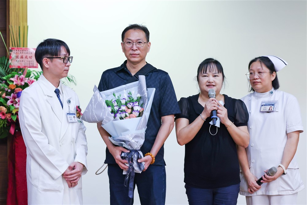 趙先生(左二)是宜花東首例裝置長效型心室輔助器病人,趙太太感謝張睿智醫師(左一)以高超的醫術救治,還有醫院團隊的照顧與關懷。