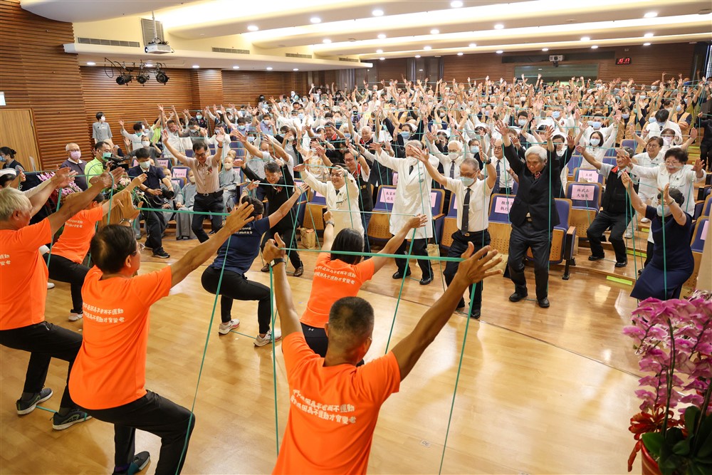 花蓮慈院「壽喜燒」員工健康運動中心的教學團隊帶動現場一起做彈力繩運動。攝影/劉明繐
