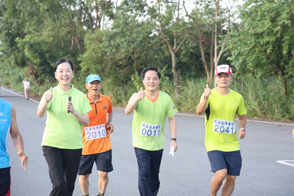 清晨四點半,大愛樓前圓環廣場已聚集參加路跑、健行的朋友,隨著音樂旋律跟著長照部照服員一起做暖身操。五點十分,由林欣榮院長鳴槍開跑,眾人沿著中山路、國福大橋、落羽松小徑、田間小路,在美景相伴下,以跑步、健走、騎腳踏車等不同方式,回到慈濟人心靈的故鄉靜思精舍。