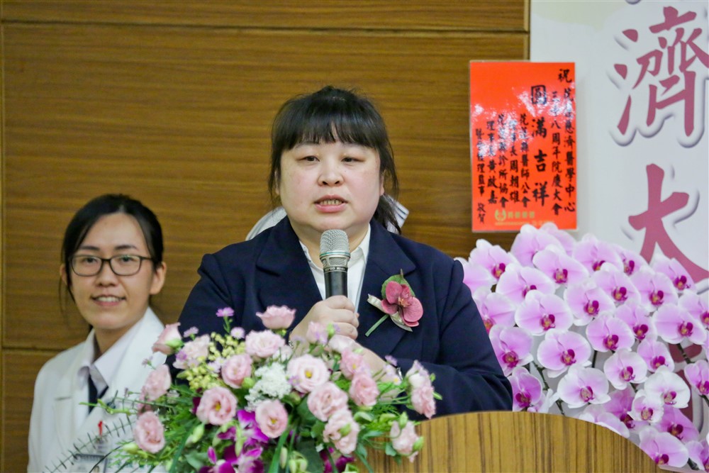 瑞雲護理長接著提及自己有幸在三十四年前舉家搬遷到花蓮定居,並帶領學弟妹學習臨床作業,現在同事和自己的小孩都已經進入慈濟大學念書,「未來也期望他們可以投入慈濟大家庭開枝展葉。」