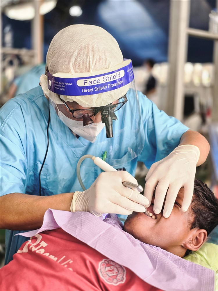 牙科的服務是「挖礦補洞拔疼痛」,就是洗牙補牙拔壞牙。牙科的三合一團隊正是牙醫、牙助、水電,沒有牙助,牙科失能;沒有牙科管線,牙科萬萬不能。然而國際義診是四合一,還需要翻譯人員。因為醫療有團隊,因為無怨又無悔,牙科服務人次每日翻倍成長,醫療品質與運轉效率提升。