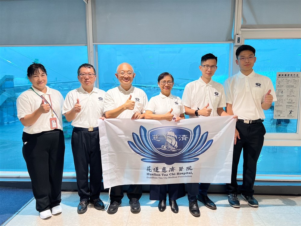 花蓮慈院六位同仁參與柬埔寨義診,左起牙科部助理黃小蘭、中醫部王健豪副主任、牙科部特殊需求者口腔醫學科李彝邦主任、生殖醫學中心陳寶珠主任、神經內科趙俊明、口腔外科梁信揚醫師。圖/魯虎憑提供