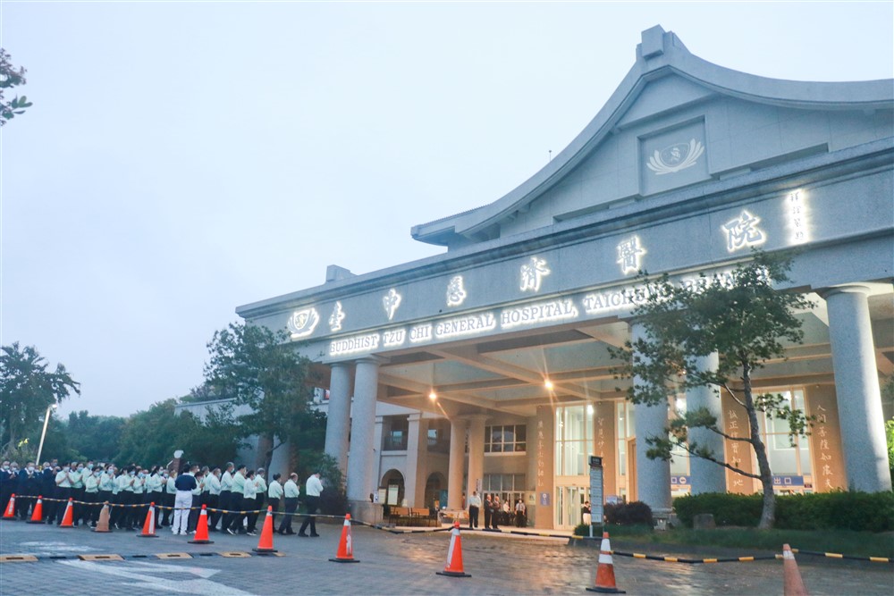 天剛破曉,晨露洗滌塵壤,尚未五點,台北慈濟醫院院前廣場已聚集一行整齊隊伍,準備進行經行儀式。引磬聲及木魚聲響起,莊嚴佛號陣陣傳出,伴隨蟬鳴鳥叫,寧靜祥和。眾人隨著「南無本師釋迦牟尼佛」佛號,以趙有誠院長為首,雙手合十,同步前進,專心感受當下,心神合一。其中,除了醫院同仁及志工,尚有一般民眾參與,且即使行動不便、年長等不方便跪拜的會眾,皆齊心謙卑問訊,同祈世界無災無難。