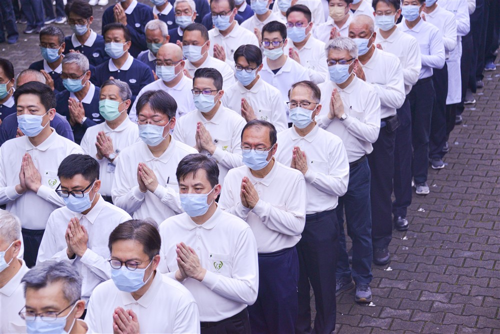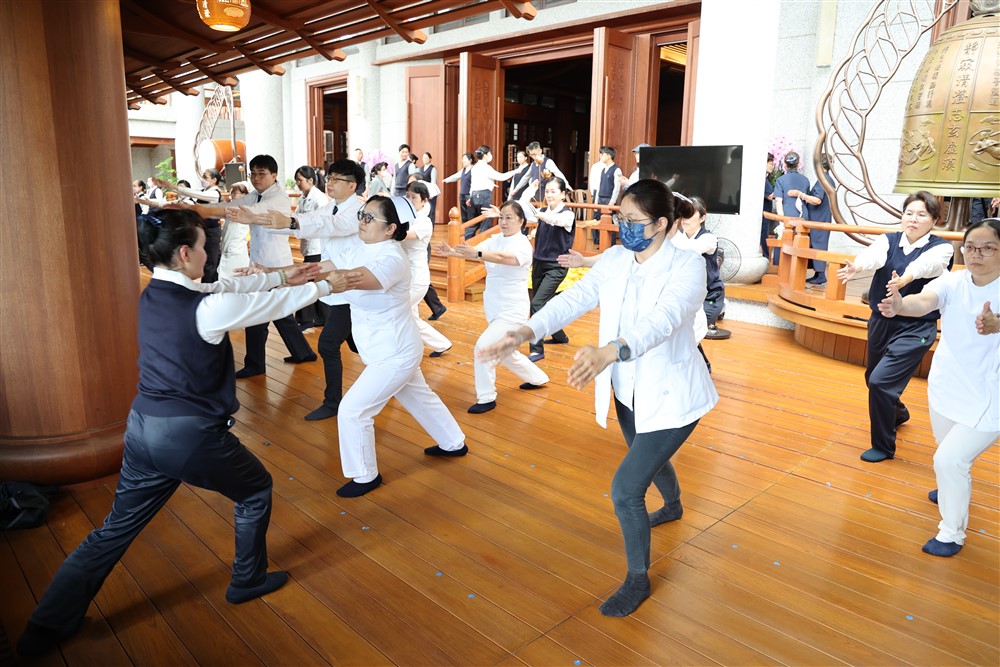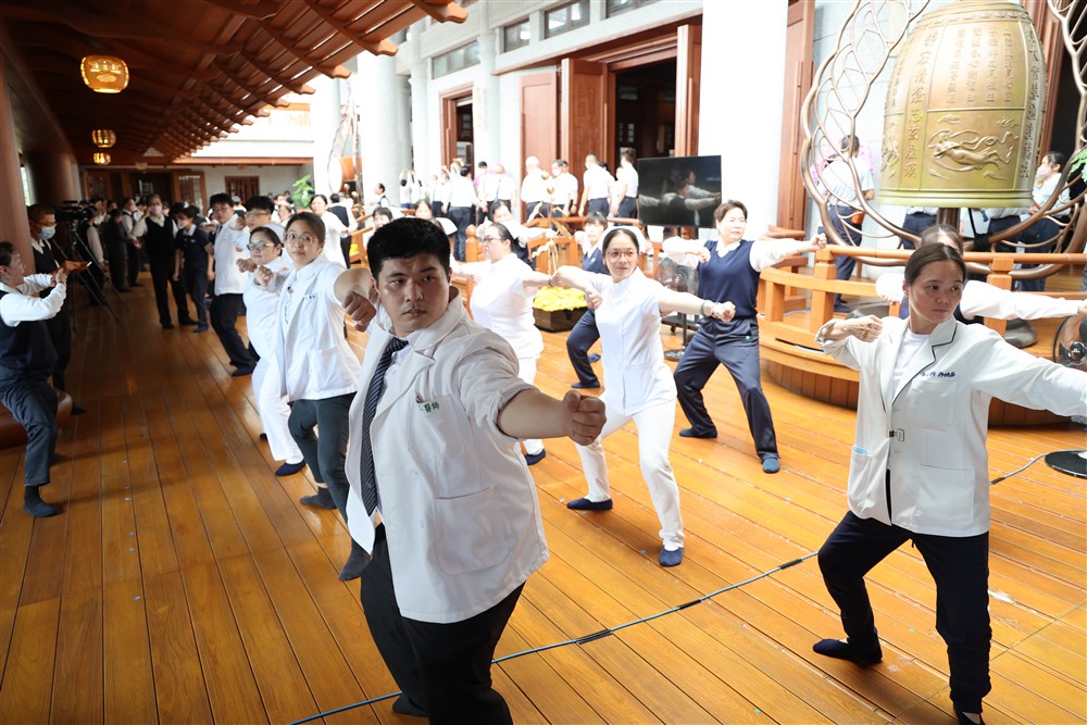 接續上午的早會和藥師法會等淨心虔誠的靜態活動之後,下午則動起來「傳法健身」,各志業體聯合以無量義經德行品經文梵唄,結合太極拳健身動作輪番演示,在靜心、莊嚴與整齊劃一中舒筋展骨、活絡氣血,傳法健身,將佛法融入於每一句的經文梵唄和舉止動作中。