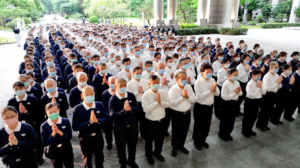 中區第四聯區志工承擔朝山工作人員,人文組同仁王玉仙說:「感恩師兄師姊護持成就莊嚴道場,室外雖然下小雨,但在佛號聲中,宛如天降甘露法水滋養每個人。」王玉仙指出,和往年的三步一跪拜不同,改成全程經行,減少老菩薩跪拜時的壓力,讓心念專注當下。