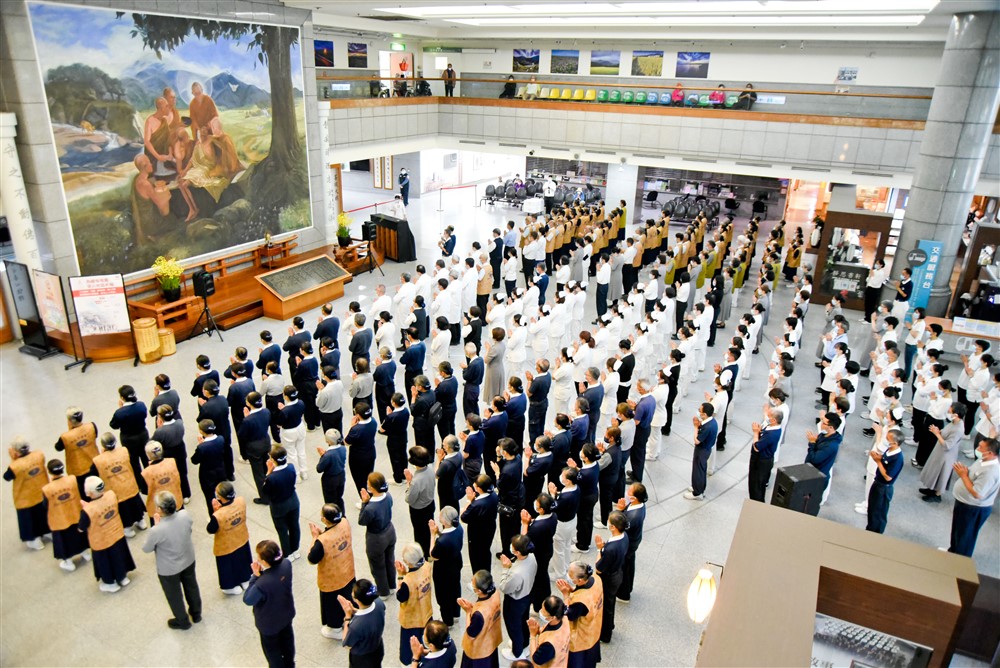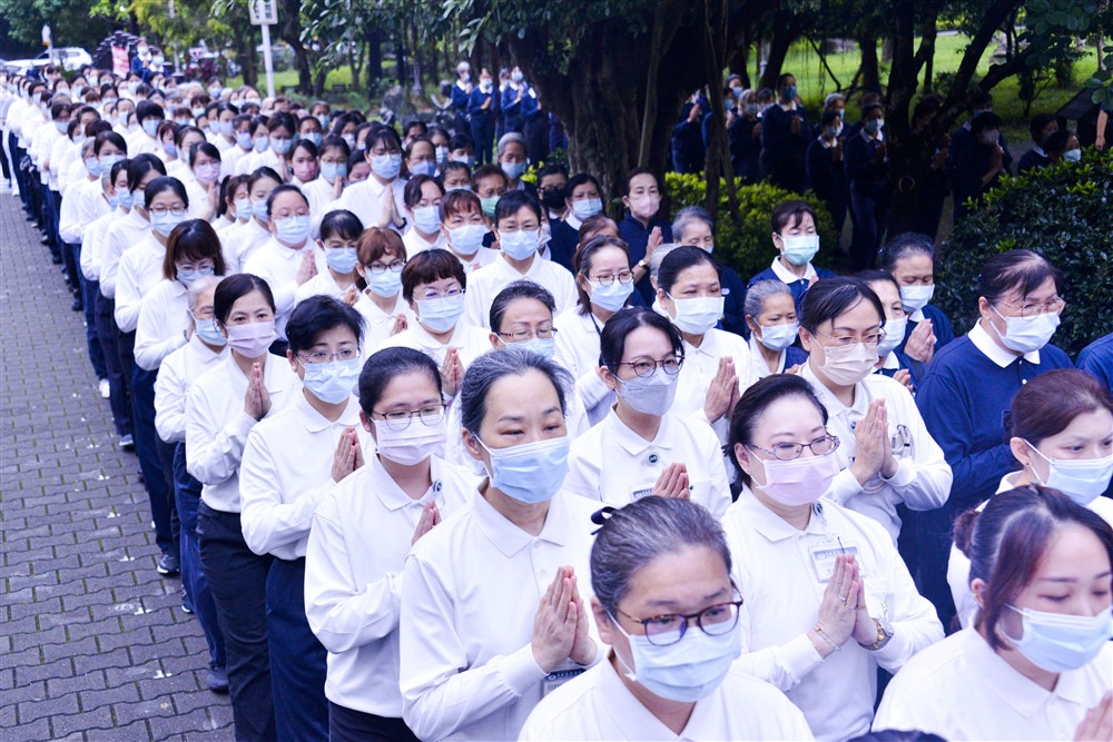 清晨五點雲層仍厚,天空落下綿綿細雨。台中慈院朝山隊伍浩蕩長,簡院長和院長室主管在前方引領大眾,隨著引磬聲響起,全體齊聲念誦佛號,隊伍整齊一致,一步一腳印走入慈院大廳佛陀問病圖前,虔誠邁向自性靈山。