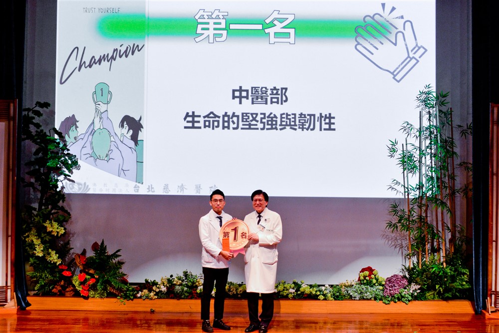 競賽第一名由中醫部的劉上銘住院醫師獲得。他分享的是一名五十八歲罹患罕見腹膜癌的師姊的故事。她曾在二○○一年罹患第三期大腸癌,經歷手術、化療與放療,休養多年後於二○二二年因腹水復發,確診罕見腹膜癌。自此,她開始一連串艱辛的治療,體重從四十二公斤驟降至二十七公斤,卻始終堅持面對。治療過程中,因為嚴重的噁心、腹脹、腹瀉,中西醫團隊都不斷地努力替病人緩解不適,讓她把握時間跟家人說更多的話、完成心中的心願。