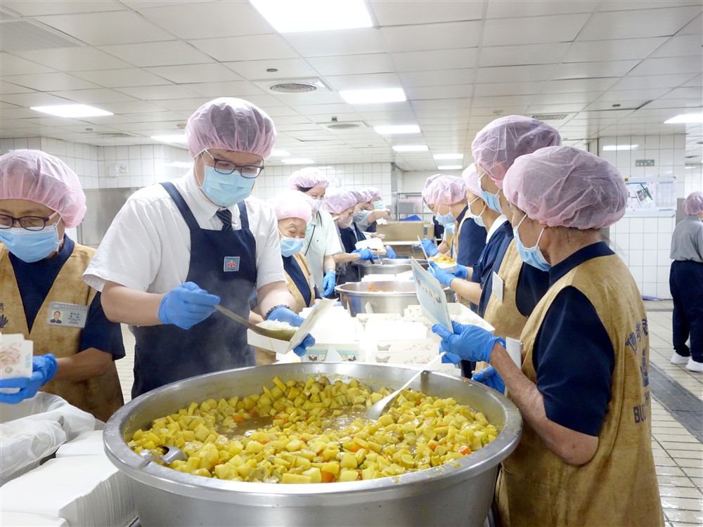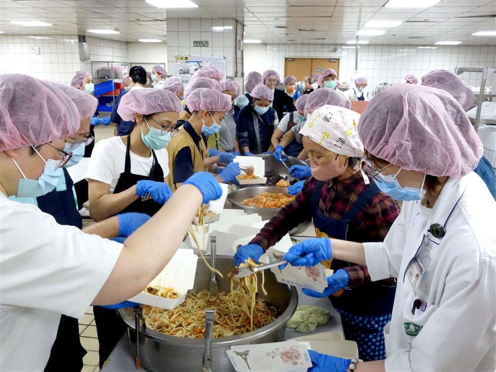 大林慈濟醫院醫院同仁與社區志工得知需支援災區便當製作後,紛紛撥空趕到營養科協助。