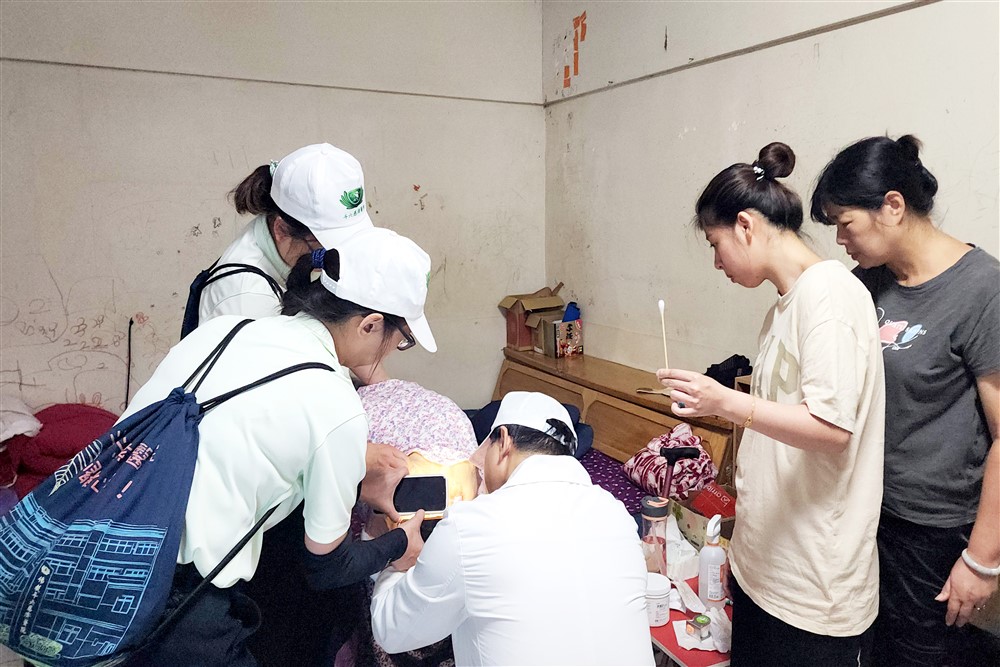 大林慈院副院長暨斗六慈院院長簡瑞騰,在志工帶領下來到水上鄉牛稠埔。一戶鍾姓人家的平房屋頂被颱風掀飛,僅剩兩側房屋勉強可住,屋內住著一位九十歲阿嬤,剛從大林慈院治療完褥瘡出院,正由孫女清創傷口。簡院長發現阿嬤的傷口很深,但孫女怕阿嬤疼痛不敢碰觸膿瘡,立即與護理師接手,展現專業護理,並教導正確清創方式。