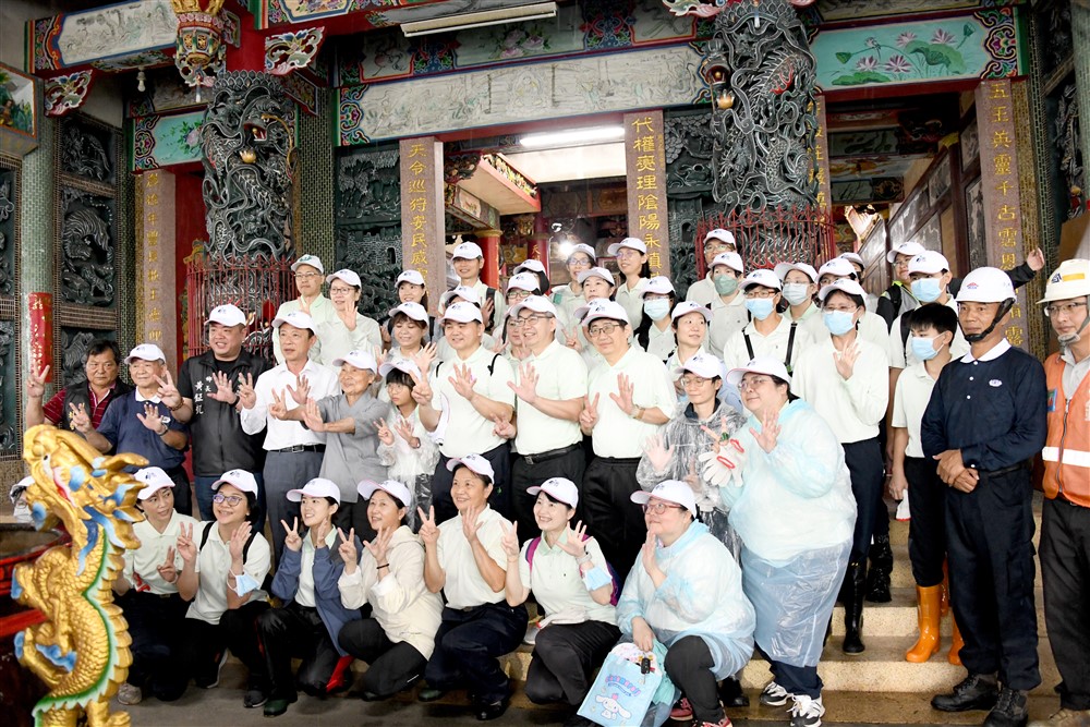 斗六慈濟醫院院長簡瑞騰、大林慈濟醫院副院長曾國枝帶領下,四十三位大林及斗六慈院的同仁、眷屬與志工,冒雨前往六腳鄉港尾寮代天府集合,準備參與慈濟志工的修繕工作。目前擔任衛福部醫福會副執行長的前大林慈濟醫院副院長林名男也特地南下加入行列。