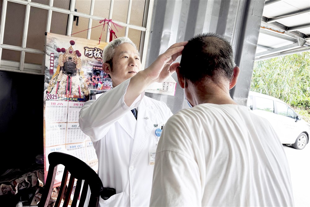 簡瑞騰院長發現一位阿嬤的傷口很深,立即與護理師接手,展現專業護理,並教導家人正確清創方式。攝影/黃小娟