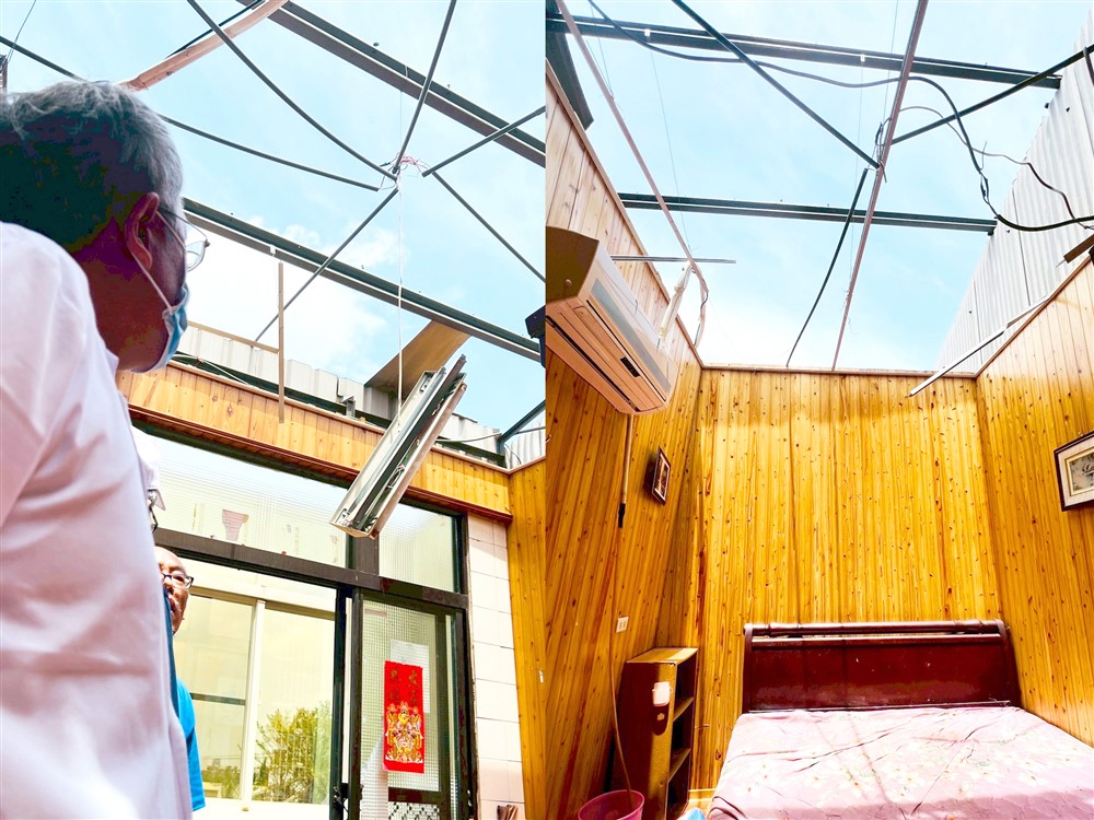 水上鄉魏女士的家受災嚴重,屋內一片漆黑,停電尚未恢復,廚房屋頂破了一個大洞,陽光斜射而入,卻無法照亮濕滑的地板與破損的瓦片。她小心地引導賴寧生院長與團隊進屋,指著漏水處無奈地說:「下雨天就像屋外下大雨、屋內下小雨一樣,只能用帆布勉強遮蓋,這裡每戶人家都一樣。」