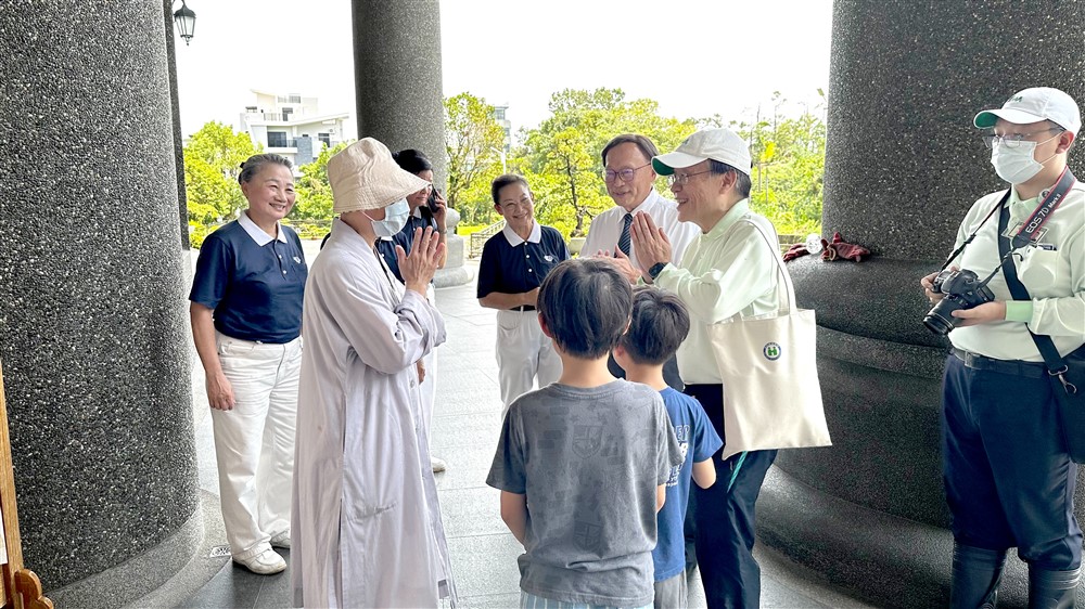 大林慈院賴寧生院長帶領同仁到妙雲蘭若與台中慈院團隊會合,感恩台中慈院聞聲救苦,跨區支援。圖為妙雲蘭若的師父向簡守信院長(右一)與賴寧生院長(右二)致意。攝影/周杏珍