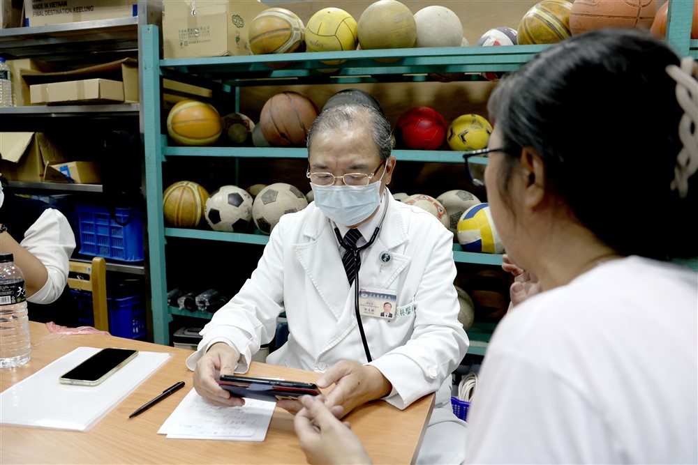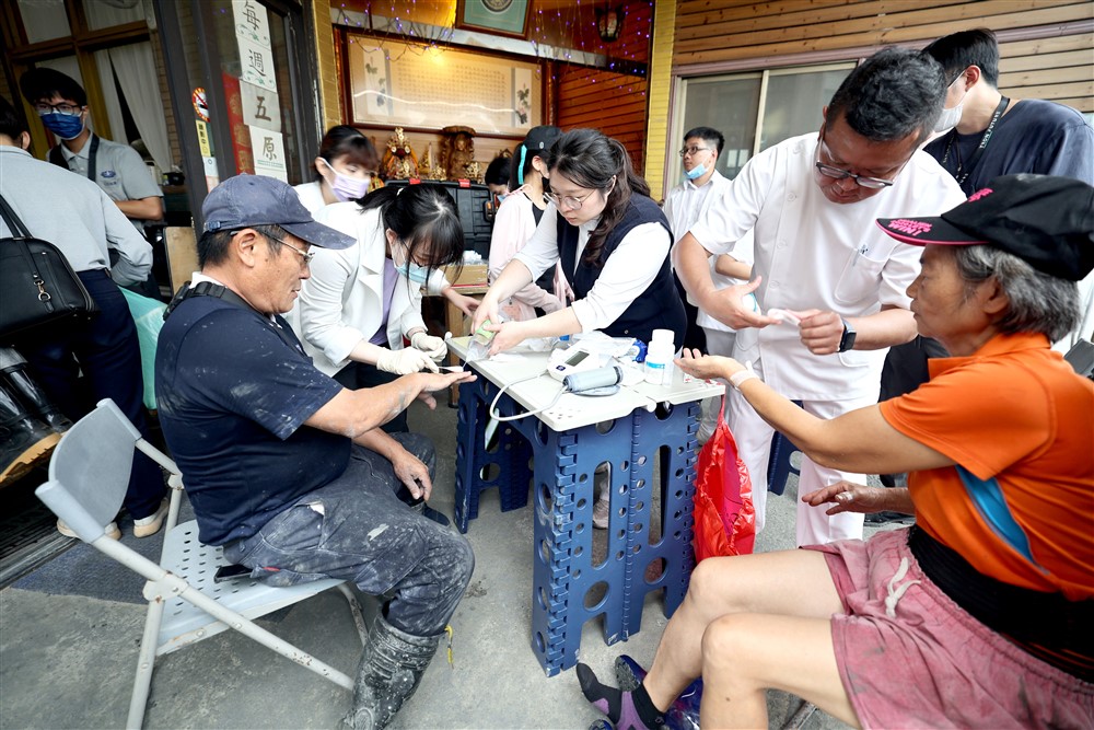 七十多歲的徐阿嬤在撤離時不慎被暴漲泥水沖走,幸好緊急救回,阿嬤不只受到驚嚇,身體還有多處疼痛。許文林顧問為她開立止痛藥物及痠痛貼布緩解傷痛,並親切安撫。