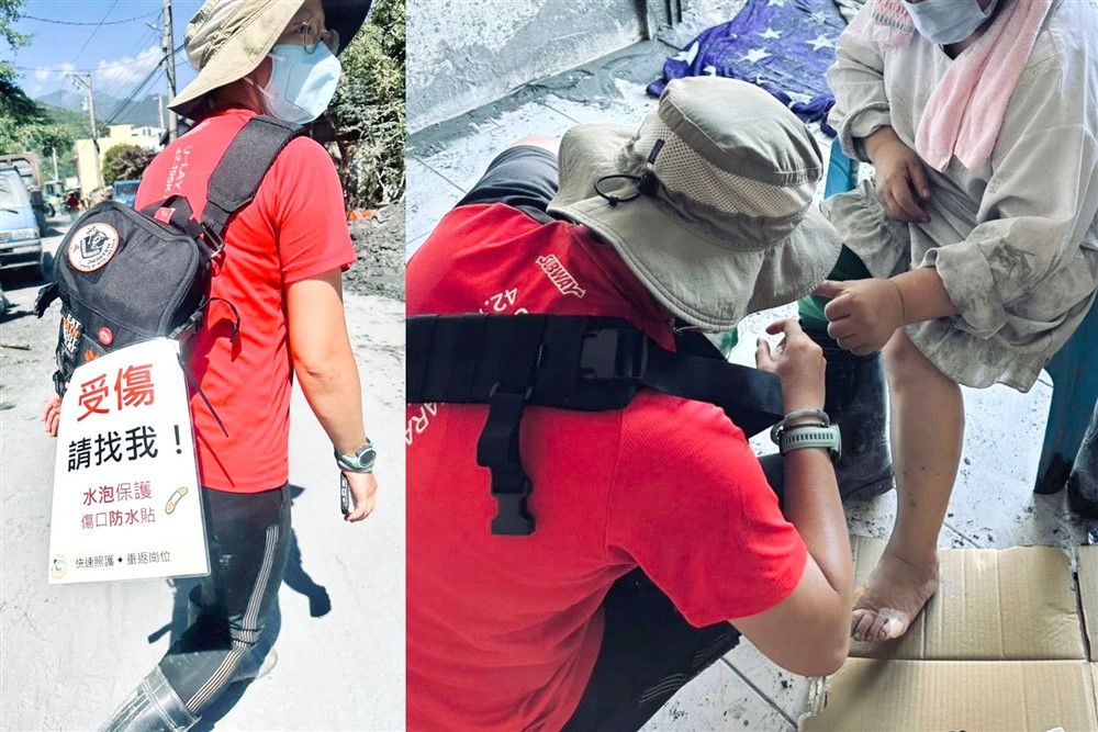 花蓮慈院行動傷口照護小組化身行走的天使,掛著「受傷請找我」的牌子,深入巷弄守護災民和鏟子超人。