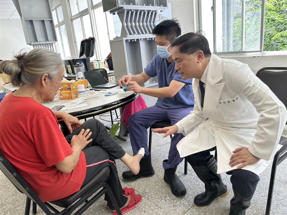 花蓮慈院院長林欣榮(右一)與一般外科醫師林修賢(右二)為民眾治療腳部外傷傷口。