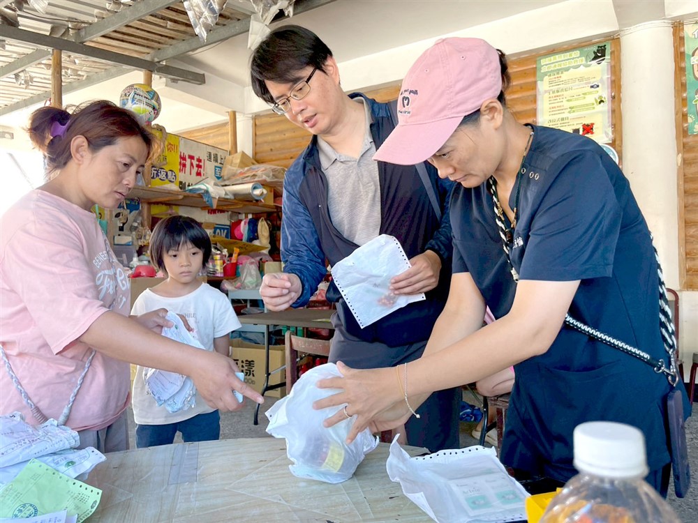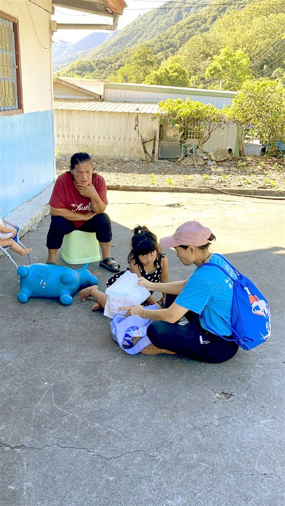 九月二十七日,王愛倫護理師(右一)帶著藥品和物資與弟弟徒步上山,逐戶關心村民健康狀況和醫療需求,並細心衛教。圖/關山慈院提供